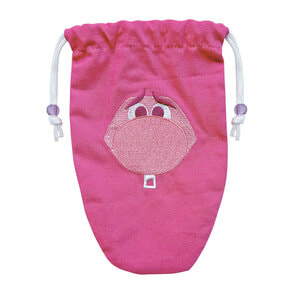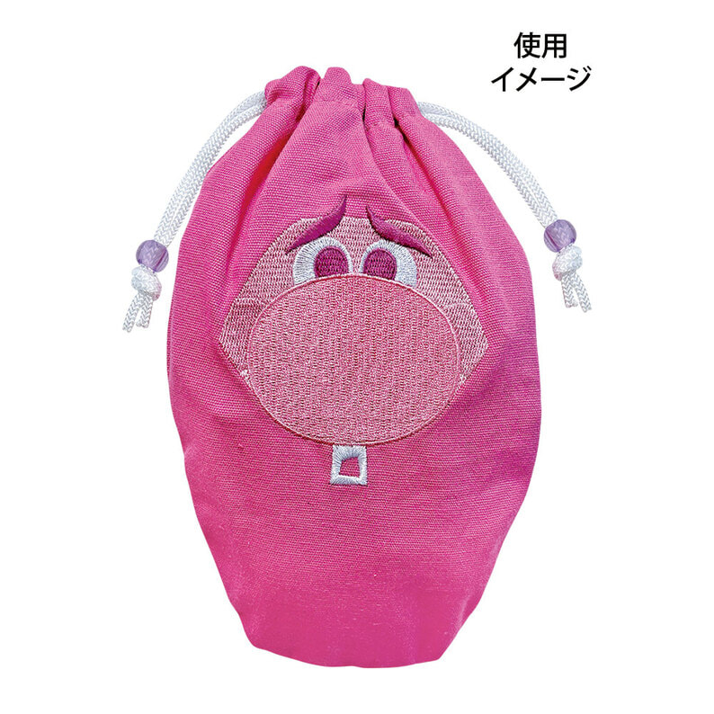 「ハズカシ」型巾着。パーカーのフードをかぶりっぱなしなイメージで巾着を絞ってお使いください。 ●サイズ:約15×23cm ●綿製 刺繍 アクリルビーズ付き ●中国製