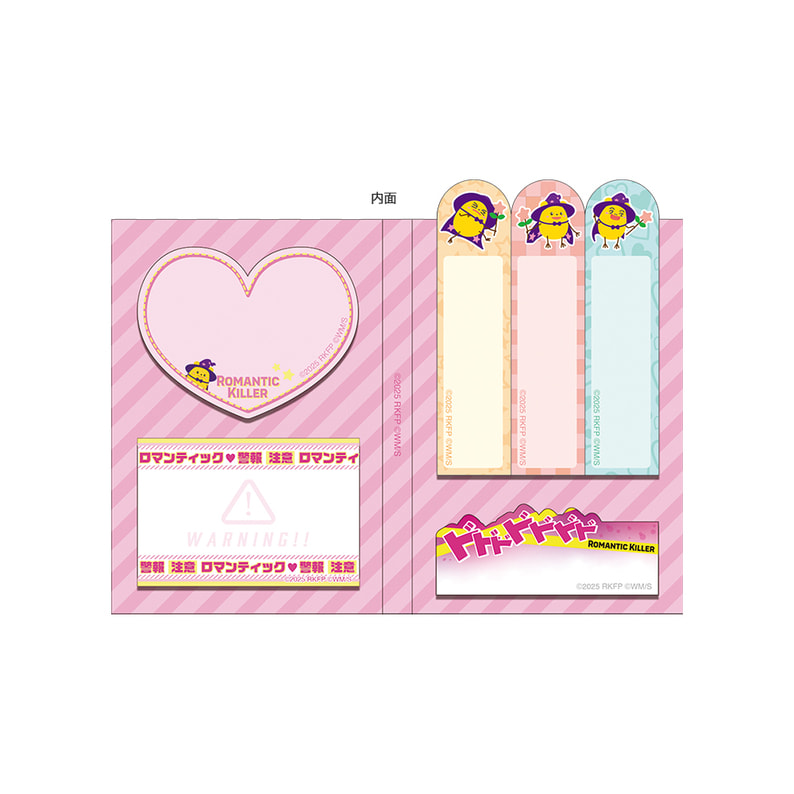 閉じたときに上からはみ出るリリが可愛い!ロマンティックな出来事はぜひ「注意 ロマンティック♥警報」の付箋に書き込んでください!●サイズ:約11.6×8cm (開いたとき)●付箋6種×各15枚綴り●紙製●日本製