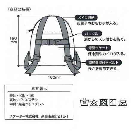 キャラクターのリュックがとってもかわいい! お子様の背中をひんやり&あったか快適にお出かけ! 背面ポケットに保冷剤やカイロを入れて、外出時の熱中症対策や防寒対策に。 メイン部分には、おもちゃやお菓子などが入ります。 肩からのズレ落ちを防止するベルト付き。 1才前後のお子様におすすめのかわいいサイズです。 【商品サイズ(約)】 サイズ:縦190×横160mm(バッグ部分) 厚み25mm 重さ:85g 【品質表示】 表地・ベルト:綿 裏地:ポリエステル 中材:発泡ポリエチレン ※防水加工はされておりませんので、バッグ内に溜まった水分が染み出てくる場合があります。 ※洗濯機・乾燥機の使用はお控えください。 ●中国製 ※掲載画像はあくまでイメージです。実際の商品とは色、柄等が異なる場合がございます。何卒ご了承ください。