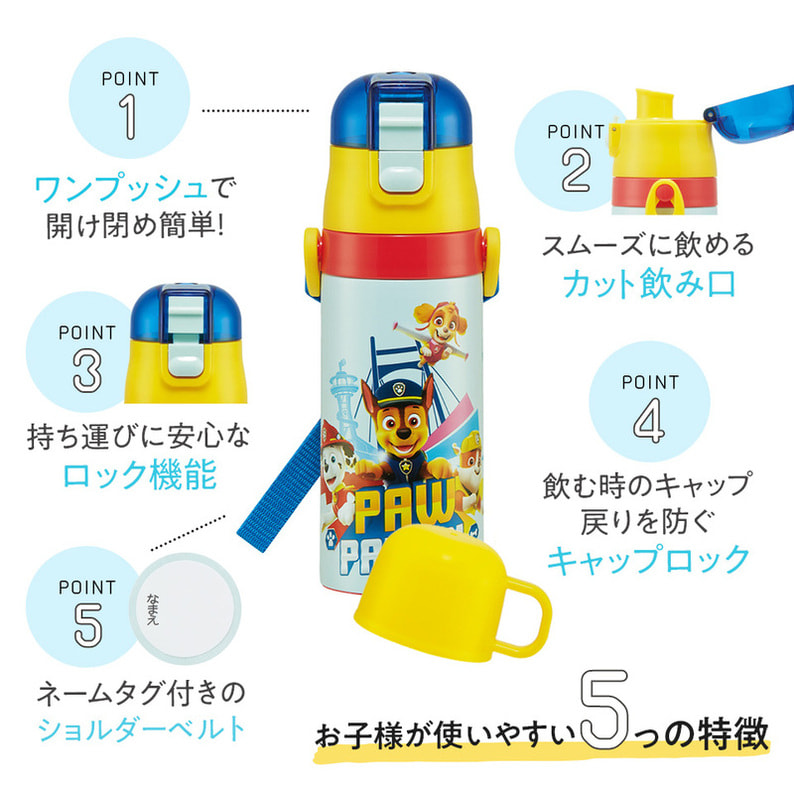 学校によっては水筒のタイプ指定がある場合も・・・。 そんな時には2通りの使い方ができるこちらをオススメ★ 2種類ある飲み口を付け替えて、直接口を付けて飲めるダイレクト飲みタイプと、温かい飲み物もOKのコップ飲みタイプで使い分け! そのまま飲めるダイレクトキャップユニットには誤作動による開閉を防ぐロック機能付き。 氷が入れやすいワイド口径。ネームプレート付きのショルダーベルト&お名前シール付き。見つけやすいカラーパッキン仕様。 【保温効力】 (中栓使用時)74度以上(6時間) 【保冷効力】 (中栓使用時)8度以下(6時間) (キャップユニット使用時)9度以下(6時間) 【ご注意】 ダイレクトタイプでご使用時には、熱い飲み物を入れて飲まないで下さい。 (火傷する恐れがあります) ◆電子レンジ、食洗機、乾燥機には【使用不可】 【商品サイズ(約)】 コップ飲みタイプ:直径68mm×高さ197mm ダイレクトタイプ:直径68mm×高さ210mm 容 量 コップ飲みタイプ:350ml ダイレクトタイプ:410ml 重 量:260g 【品質表示】 内びん・口がね:ステンレス鋼 胴部:ステンレス鋼(アクリル樹脂塗装) コップ・中栓・フタ:ポリプロピレン キャップ:飽和ポリエステル樹脂 パッキン:シリコーンゴム 底板:熱可塑性エラストマー ※自動食器洗浄機・食器乾燥機は使用しないでください。 ※ダイレクト飲みの際は保冷専用です。熱い物を入れて飲まないでください。直接飲むと口内やけどをする場合があります。 ●中国製 ※掲載画像はあくまでイメージです。実際の商品とは色、柄等が異なる場合がございます。何卒ご了承ください。