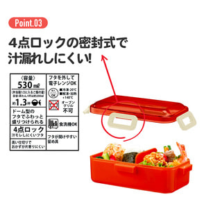 ○●○新柄!I’m Doraemon お空さんぽ●○● ドーム型のフタで、"ふんわり"とご飯やおかずが詰められる。 高い仕切付きでおかずが片寄りにくい。片手で持てるスリムタイプ。 4点ロックの密封式で汁漏れしにくい。 フタを外して電子レンジOK!食洗機OK!! 【商品サイズ(約)】 サイズ:186×108×62mm 容量:530ml 【品質表示/耐熱温度】 フタ:AS樹脂/耐熱温度100度 本体・止具・仕切:ポリプロピレン/耐熱温度140度 パッキン:シリコーンゴム/耐熱温度140度 使用抗菌剤の種類:無機抗菌剤 加工方法:練込 加工部位:全体 SIAAマークはISO22196法により評価された結果に基づき、抗菌製品技術協議会ガイドラインで品質管理・情報公開された製品に表示されてます。 ※すべての細菌の増殖を抑制するものではありません。 ●日本製 ※掲載画像はあくまでイメージです。実際の商品とは色、柄等が異なる場合がございます。何卒ご了承ください。