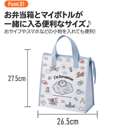 ○●○新柄!I’m Doraemon お空さんぽ●○● お弁当箱とマイボトルが一緒に入る便利なサイズ♪ マチ幅12cmの少し大きめのランチバッグです。 ちょっとしたお出かけの普段使いとして、おサイフやスマホなどの小物を入れても便利! サブバッグとしても大活躍します。 ※密封タイプではありません。 【商品サイズ(約)】 サイズ:横265×縦275×マチ120mm 重量:85g 【品質表示】 表地・不織布:ポリプロピレン 裏地:アルミ蒸着フィルム 持ち手・パイピング:ポリプロピレン ●中国製 ※掲載画像はあくまでイメージです。実際の商品とは色、柄等が異なる場合がございます。何卒ご了承ください。