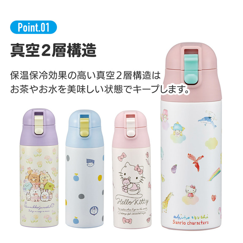○●○新柄!I’m Doraemon お空さんぽ●○● ワンプッシュオープンで、飲みたい時に"サッ"と飲めるステンレスマグボトル☆ 真空二層構造なので、保温・保冷効果が長持ち♪ 保温効力:63度以上(6時間) 保冷効力:9度以下(6時間) 【ご注意】 熱い飲み物を入れた際は火傷の恐れがありますので飲める程度まで冷ましてからお飲み下さい。 ■飲み口はソフトなプラスチックタイプ ■持ち運びに安心のロック機能付き ■飲む時に戻らないフタロック設計 ■氷が入れやすい広口タイプ ※電子レンジ・食洗機は使用不可です。 【商品サイズ(約)】 サイズ:直径67×高さ225mm 容量:500ml 重量:240g 【品質表示】 内びん、口がね:ステンレス鋼 胴部:ステンレス鋼(アクリル塗装) キャップ、フタ、飲み口、リング:ポリプロピレン パッキン:シリコーン 底板:エラストマー樹脂 ●中国製 ※掲載画像はあくまでイメージです。実際の商品とは色、柄等が異なる場合がございます。何卒ご了承ください。