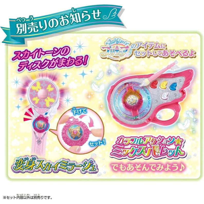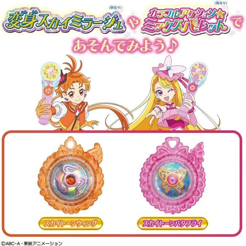 「ひろがるスカイ!プリキュア」より「スカイトーンセットウィング&バタフライ」が登場! スカイトーンを別売りの「変身スカイミラージュ」本体にセットすると球体内で光のアニメーションがスタート!付属のスカイトーンを付け替えることで、キュアウィング、キュアバタフライのそれぞれの変身遊びが楽しめます。 【セット内容】 ・スカイトーンウィング(1個) ・スカイトーンバタフライ(1個) (本商品に付属のセット内容以外、すべて別売りです。) ※本品は、別売りの「変身スカイミラージュ キュアウィング&キュアバタフライ」に付属のスカイトーンと同じものです。 ●電池不要 ●対象年齢3歳以上 ©ABC-A・東映アニメーション