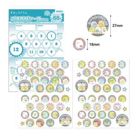 すみっコぐらしの、ほめてのばすコメント付きホログラムシール。 キラキラ輝くごほうびシール!ボリューム満点でたっぷり使えます。 ●パッケージサイズ:W125×H182(mm) ●素材:紙 2シート・計68枚入(直径18mm×64枚 / 直径27mm×4枚) (C)2020 San-X Co., Ltd. All Rights Reserved.