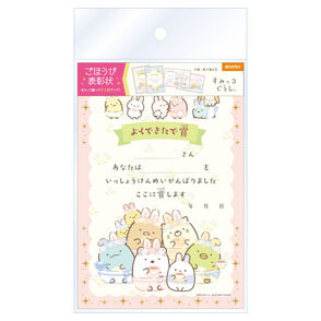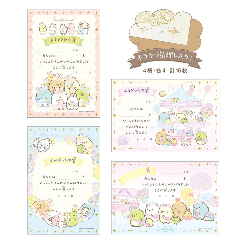 すみっコぐらしの可愛いキャラクターの4柄16枚入り。オリジナルの賞でほめられるフリータイトルデザインも入っています!
