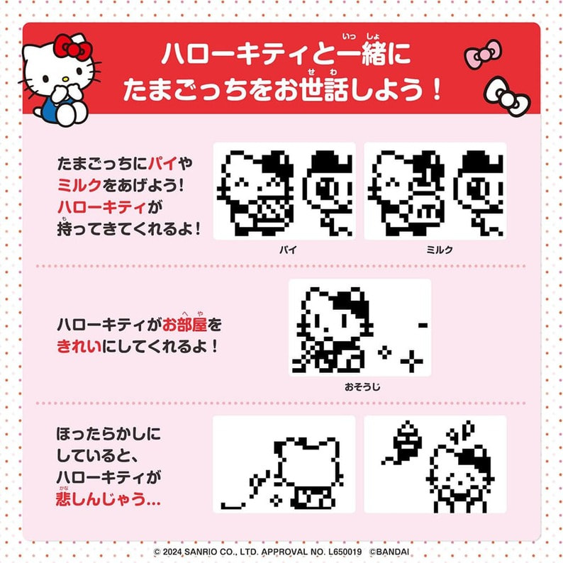 ハローキティがパイやミルクを持ってきてくれたり、お掃除をしてくれたり、ハローキティと一緒にたまごっちをお世話することができます。