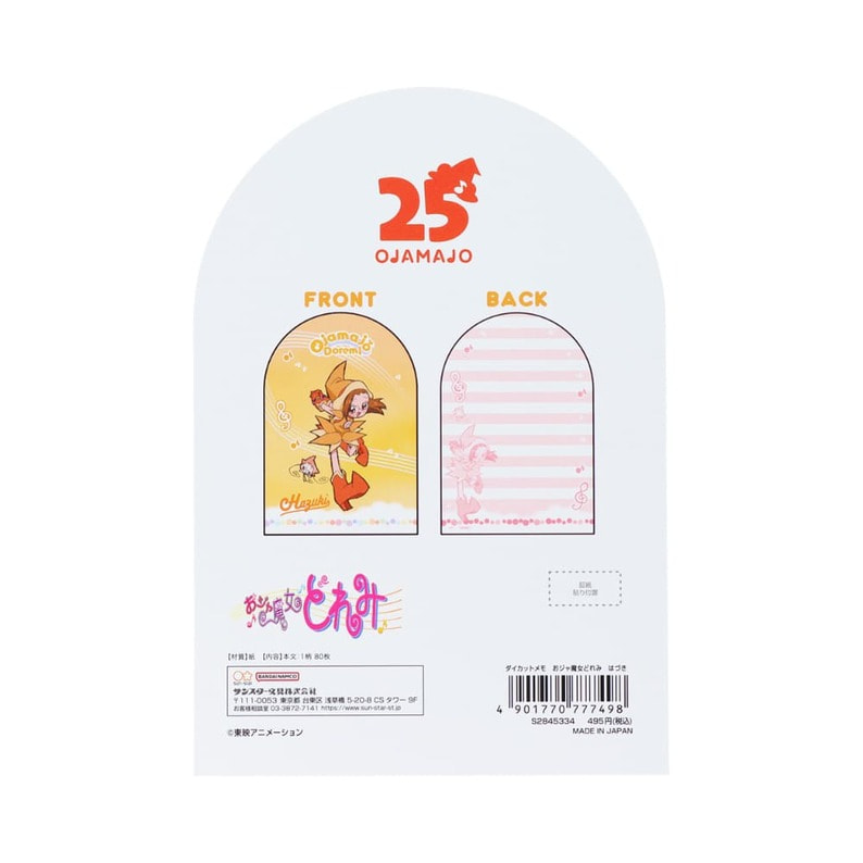 1999年に放送を開始した「おジャ魔女ドレミ」の25周年を記念した特別なデザインのダイカットメモ(はづき)が登場! ●サイズ:約W103×H145×D11mm ●内 容:1柄×80枚 ●素 材:紙 ●生産国:日本