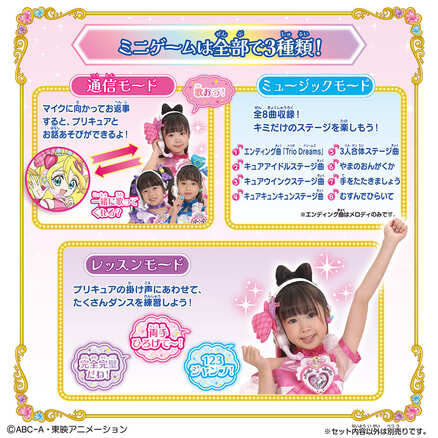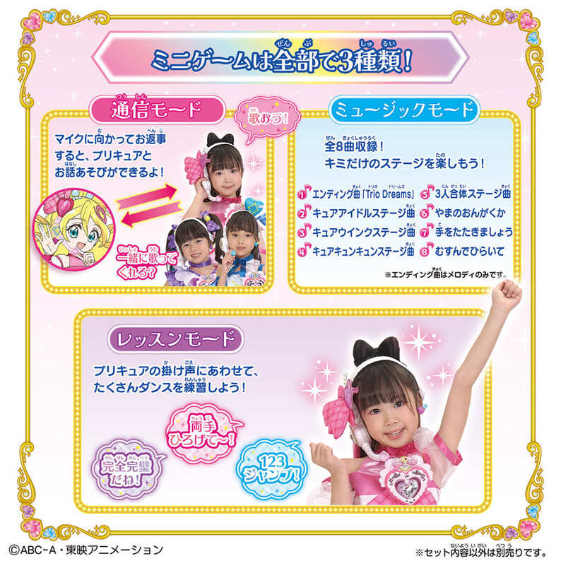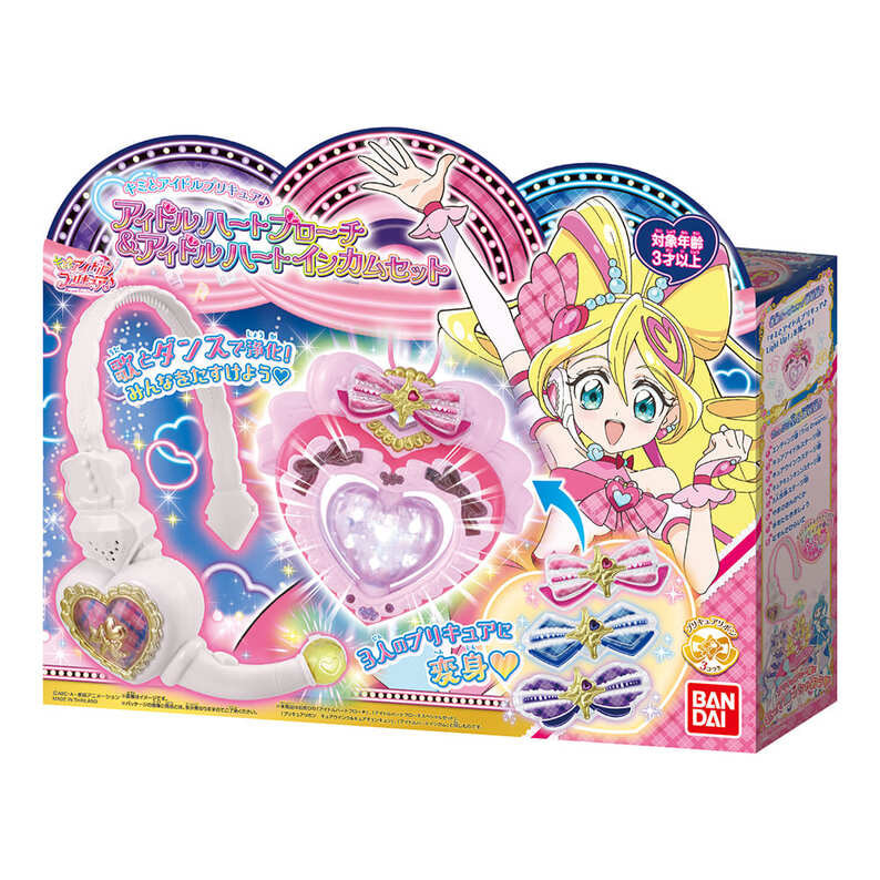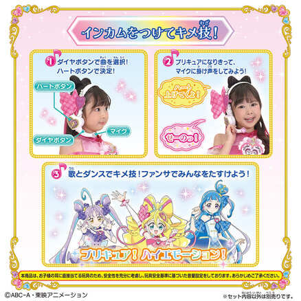 『キミとアイドルプリキュア♪』より、「キミとアイドルプリキュア♪アイドルハートブローチ&アイドルハートインカムセット」が登場! このアイテムでアイドルプリキュアになりきれるスペシャルなセットです。 「キミとアイドル変身♥アイドルハートブローチスペシャルセット」と「うたっておどってファンサして♥アイドルハートインカム」のセットです。 このアイテムでアイドルプリキュアになりきれます! ◎キミとアイドル変身♥アイドルハートブローチスペシャルセット 3人が使用する変身アイテムです。 ハートのミラーボールが光って!回って!楽しい変身アクションが楽しめます。 ◎うたっておどってファンサして♥アイドルハートインカム プリキュアになりきって、マイクに声をかけると声に反応してマイクが光ります。 サイズ調整可能なカチューシャです。 キミとアイドルプリキュア♪のエンディング曲など全8曲を収録! さらにミニゲームが全部で3種類搭載。 [セット内容] ・アイドルハートブローチ・・・1個 ・プリキュアリボン(キュアアイドル)・・・1個 ・プリキュアリボン(キュアウインク)・・・1個 ・プリキュアリボン(キュアキュンキュン)・・・1個 ・アイドルハートインカム一式・・・1個 [使用電池] ・LR44×3個(付属) ・単4乾電池×3本(別売り) (本商品のセット内容以外は付属しません。) ●パッケージサイズ:W320×H270×D55mm ●対象年齢:3歳以上 ●原産国:タイ (C)ABC-A・東映アニメーション