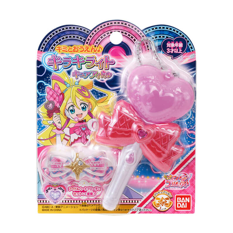 『キミとアイドルプリキュア♪』より、「キミとおうえん♪キラキライト キュアアイドル」が登場! 番組内やエンディングにも登場するキラキライトです。 ボタンを押すと光ります。 プリキュアを応援する時に使用したり、ライブステージの盛り上げにも使える応援グッズです♪ サイズは全長約120mm! 付属の「プリキュアリボン」を別売りの「アイドルハートブローチ」にセットすると3人同時変身が楽しめます。 [セット内容] ・キラキライト キュアアイドル・・・1個 ・プリキュアリボン(3人同時変身キュアアイドルカラーver.)・・・1個 [使用電池] ・LR44×3個(付属) (本商品のセット内容以外は付属しません。) ●パッケージサイズ:W130×H160×D30mm ●対象年齢:3歳以上 ●原産国:中国 (C)ABC-A・東映アニメーション
