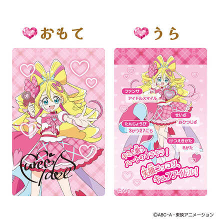 『キミとアイドルプリキュア♪』より、「キミとおうえん♪プリキュアカード&ケース」が登場! 付属のカードが持ち歩けるカードケースとカードのセットです。 アイドルプリキュアのサイン付き、両面カラーのオリジナルカードが3枚付属します! [セット内容] ・ケース本体・・・1個 ・プリキュアカード・・・3枚 (本商品のセット内容以外は付属しません。) ●パッケージサイズ:W95×H170×D5mm ●電池不要 ●対象年齢:3歳以上 (C)ABC-A・東映アニメーション