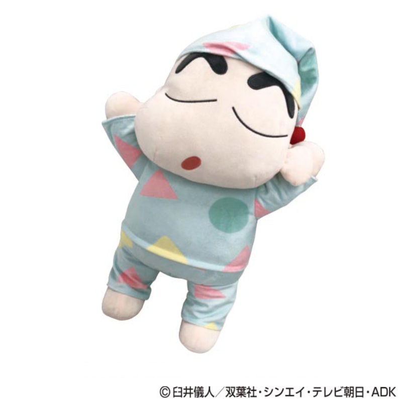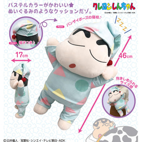クレヨンしんちゃん からパステルカラーがかわいい♪ パジャマを着たしんちゃんのおねむりポーズです!寝相が悪いのでバンザイのポーズをしています。 ぬいぐるみのようなボリューム感のあるクッションです☆ ●サイズ:約縦46cm×横31㎝×奥行17cm ●素 材:ポリエステル