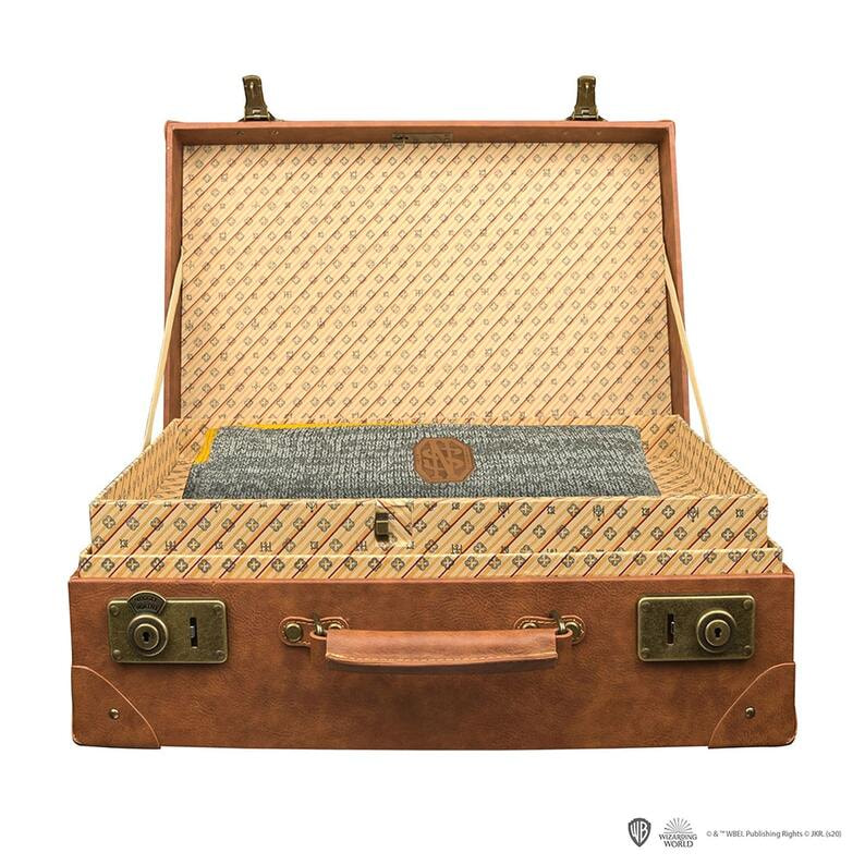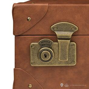 外見はごく普通だが、中はニュート・スキャマンダーの魔法動物たちが生息する無限の空間へと繋がっている、魔法のトランク。高さ約30cm × 幅約45cm × マチ約15cmの1/1スケールで立体化!金具や革の質感、内側の生地など、アンティークな雰囲気を表現している。さらにギミックとして、劇中でニュートが披露した、マグルに中身を隠すための「スイッチ機能」を搭載!ふたを閉じた状態でネームプレートをスライドして切り替えることで、ダミーの収納スペースを出したり隠したりできるぞ!また、付属の鍵でロックすることが可能。世界地図、ニュートのマフラーが付いているのも嬉しいポイントだ。