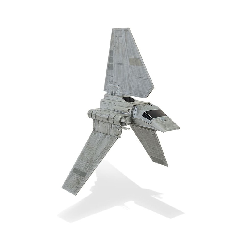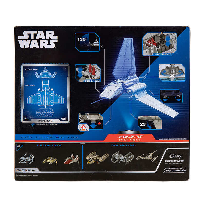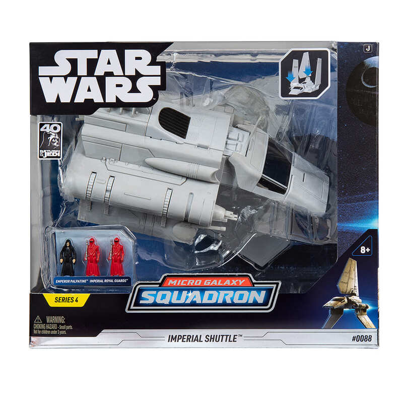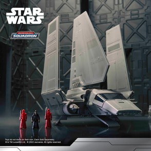 『スター・ウォーズ』に登場する帝国軍シャトル(ラムダ級シャトル)を、全長約20cmで立体化。小さいながらも細部までこだわりの造形で再現している。全高約2.5cm、手足が可動する、パルパティーン皇帝、2体のロイヤル・ガードのアクションフィギュアが付属。コクピットは開閉ができ、フィギュアを搭乗させることが可能だ。ウイングを可動させたり、機体下部の搭乗タラップや着陸脚を展開することで、さまざまなシーンを再現できるぞ。また、機体の後部を取り外して、船内で遊ぶことが可能。パッケージは、そのまま飾ってもカッコいいウィンドウボックス仕様となっている。