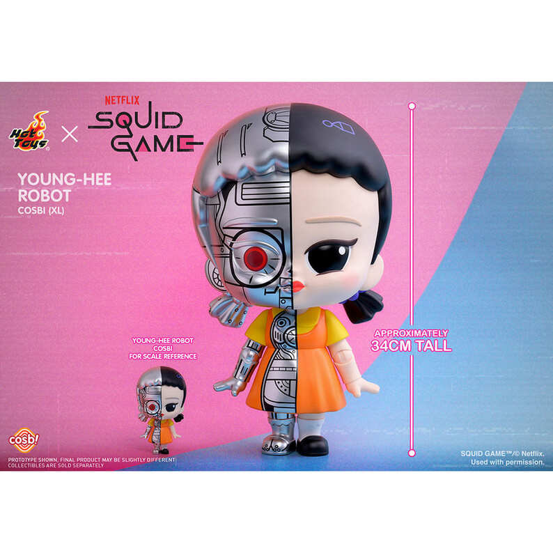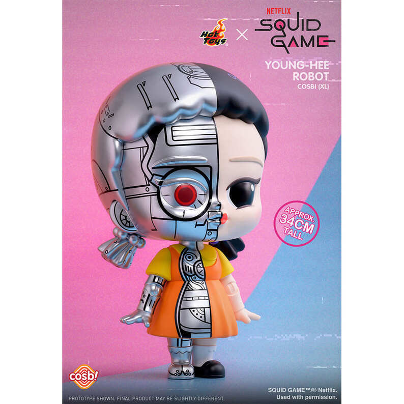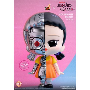 シンプルで愛らしいフォルムが特徴的な「コスビ」シリーズより、Netflixシリーズ『イカゲーム』に登場するヨンヒ人形を、キュートでポップなデフォルメフィギュアとして立体化。半分機械の体が露わになったヨンヒ・ロボットとなっている。サイズは従来の「コスビ」より大きい、全高約34cmだ!