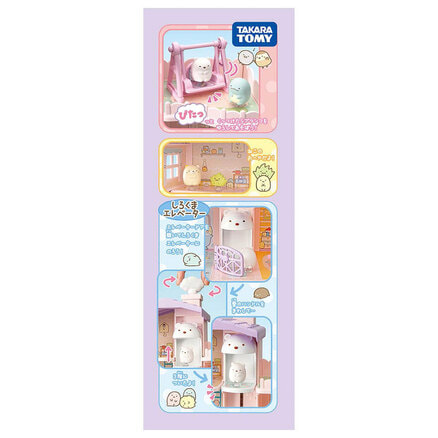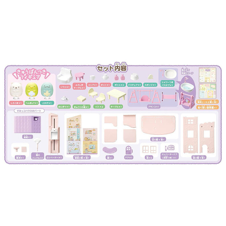 ●商品内容:しろくまエレベーターのすみっコハウス(1)、橋(1)、ドア(1)、エレベータードア(支柱つき)(1)、テーブル(1)、イス(2)、きゅうりの箱(1)、おにぎり(1)、シャワーつきバスタブ(1)、バスチェア(1)、ボトル(2)、スポンジ(1)、ソファ(1)、コップ(1)、ポット(1)、ふろしきテーブル(1)、ブランコ(1)、しろくま(1)、とかげ(1)、ぺんぎん?(1)、専用シール(2)、取扱説明書(1)