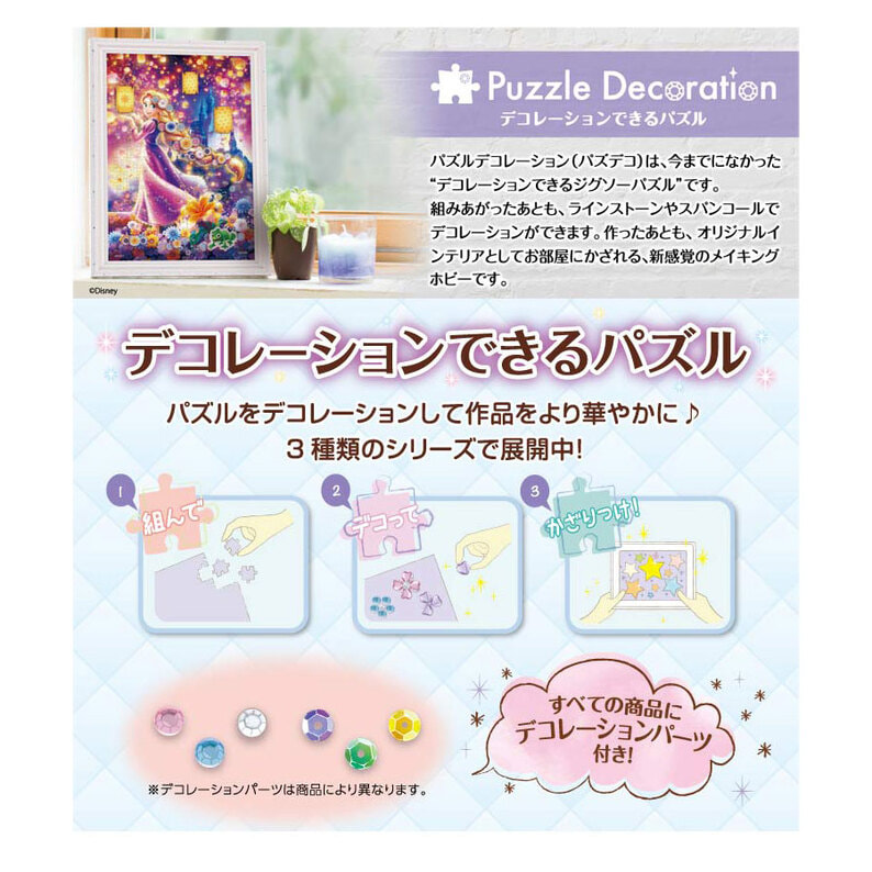 デコレーションステッカーで彩る印刷紙のデコレーションパズル、パズルデコレーションコラージュ。 ディズニー100周年をお祝いするDisney100のアートをデコレーションステッカーで彩ろう! 100枚のデコレーションステッカーを貼って華やかにコラージュアップ♪ 【セット内容】 パズル本体、パズルのり×2、デコレーションステッカー×1 ●ピース数1000 ●サイズ:50×75cm ※紙のパズルデコレーション ※フレームは、別売りとなっております。 ©Disney ©Disney/Pixar