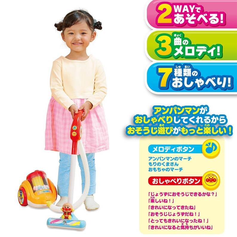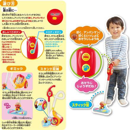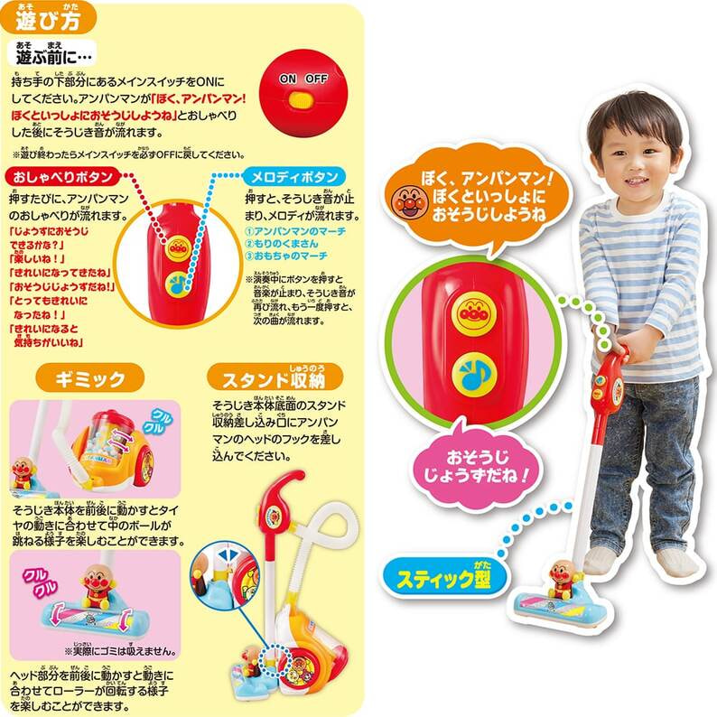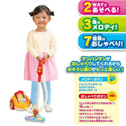 2WAYで形を変えられる本格的なそうじきです。 アンパンマンのおしゃべり7ワード、音楽3曲が流れておそうじごっこを盛り上げます。 そうじきの動きに合わせて本体のボールがコロコロ回ります。 そうじきのヘッドも前後の転がしに合わせて回転の様子も楽しめます。 ヘッド部分はホログラム加工でキラキラしているので、より本物に近いそうじきでごっこ遊びができます。 ●商品サイズ:約幅170mm×高さ175mm×奥行き230mm ●パッケージサイズ:約幅220mm×高さ300mm×奥行き180mm ●パッケージ重量:約1192g ●パッケージ形状:サック箱(縦置き・クローズドボックス) ●電池情報:単3アルカリ×2本使用(別売り) ●対象年齢:3歳以上 ●中国製 (C)やなせたかし/フレーベル館・TMS・NTV