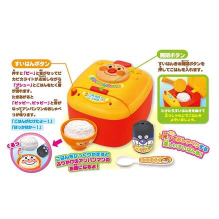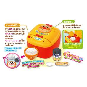 光っておしゃべりする楽しいすいはんき! ●商品サイズ:約幅105mm×高さ100mm×奥行き120mm ●パッケージサイズ:約幅250mm×高さ190mm×奥行き130mm ●パッケージ重量:約460g ●パッケージ形状:箱 ●電池情報:単4×2本使用(別売り) ●対象年齢:3才~ (C)やなせたかし/フレーベル館・TMS・NTV