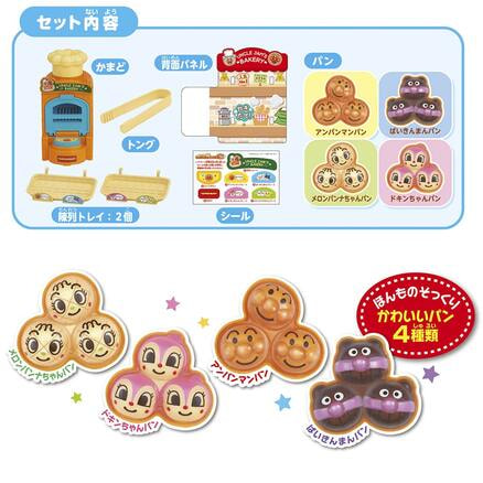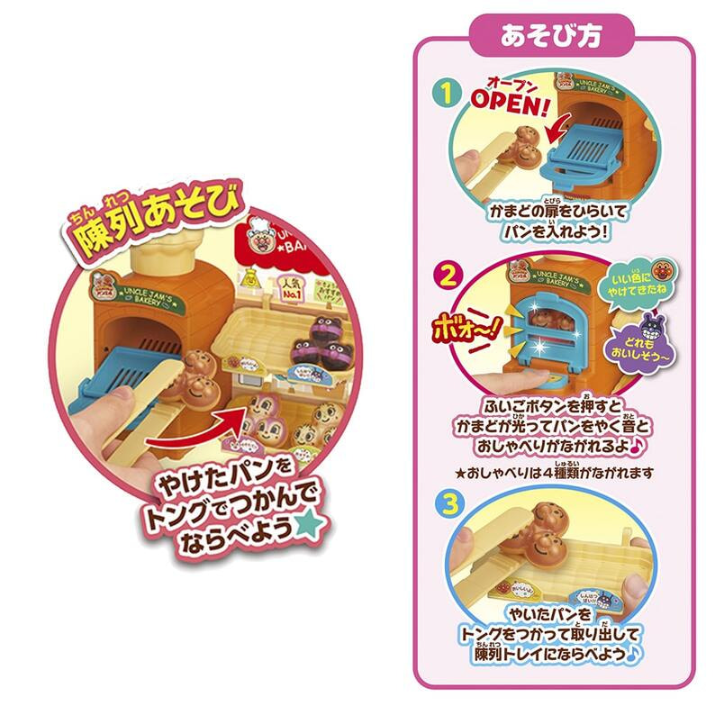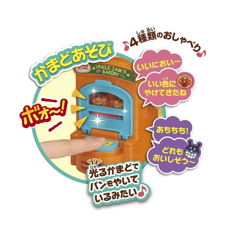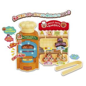 大人気の「ジャムおじさんのやきたてパン工場」がミニサイズになって新登場! かまどにパンを入れてふいごボタンを押すと、かまど内のLEDが光って色々な音声が流れます♪ リアルな可愛いパンが4種付属♪ トングを使って、パンをつかんだりトレイにのせたり、並べてパン屋さんごっこが楽しめます。 <あそび方> 1.焼きたいパンを選んでトングでつかもう! 2.かまどの扉を開いて、かまどの中にパンを入れよう! 3.ふいごボタンを押すと、かまど内のLEDが光ってボォ~!というパンの焼ける音とアンパンマンとばいきんまんのおしゃべりが流れるよ♪ 4.パンを焼いたらかまどの扉を開いてパンをトレイに取り出そう! 5.トレイを背面ボードにかけて、パンを並べてお店屋さんごっこをしよう♪ 【セット内容】 かまど、トング、陳列トレイ×2、パン(4種)、背景パネル、シール ●商品サイズ:約幅64mm×高さ127mm×奥行き93mm ●パッケージサイズ:約幅210mm×高さ190mm×奥行き70mm ●電池情報:単4×2本使用(別売り) ●連続使用時間:約20時間 ●対象年齢:3才~ (C)やなせたかし/フレーベル館・TMS・NTV