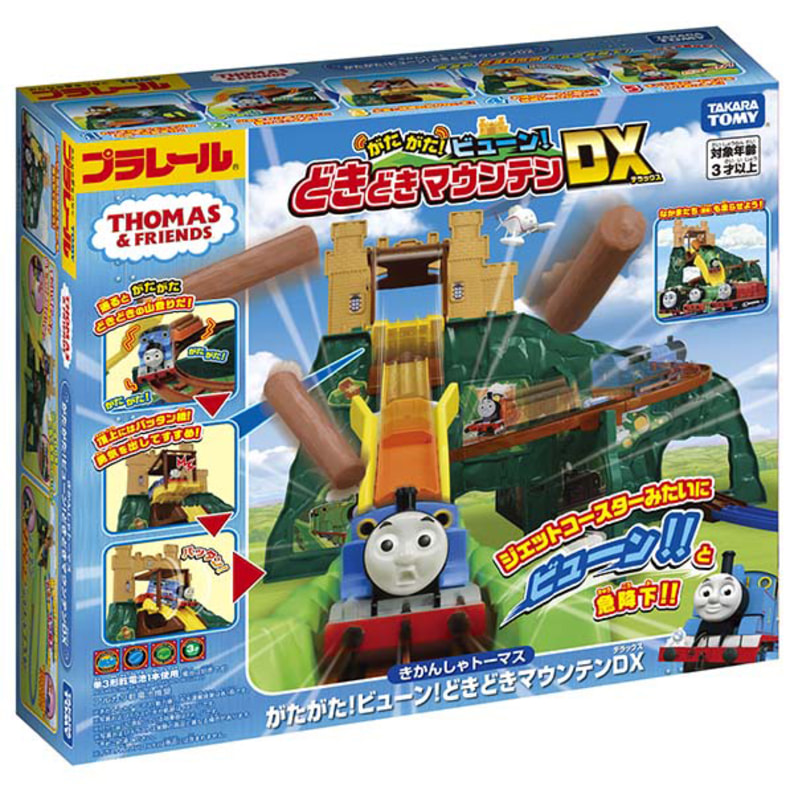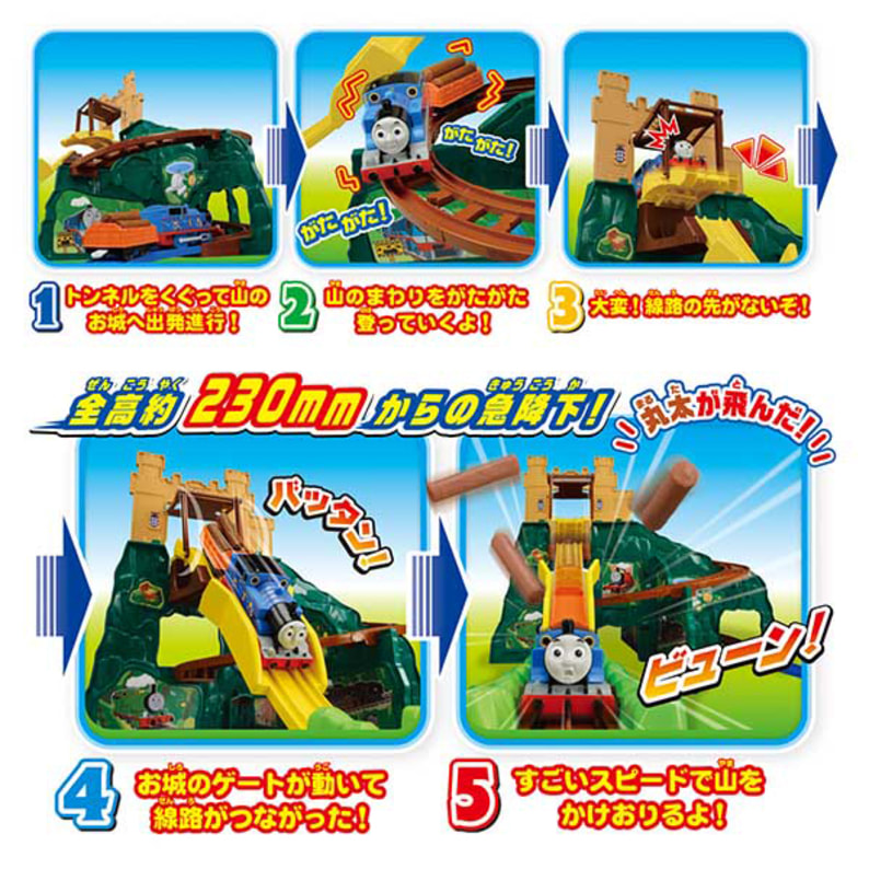スリル満点!!全高約230mmの山からジェットコースターみたいにプラレールトーマスがビューン!!と急降下!! ▶トンネルをくぐって山のお城へ出発進行! ▶山のまわりをがたがた登っていくよ! ▶大変!線路の先がないぞ! ▶お城のゲートが動いて線路がつながった! ▶すごいスピードで山をかけおりるよ! トーマス車両・マウンテン・レールが全部入ったオールインワンセット 別売りのプラレールトーマスシリーズ車両も一緒に走らせよう! ●対象年齢:3歳以上 ●電池:単3電池×1本(別売) ●製造国:タイランド ●セット内容:マウンテンパネル(1~4)×4、坂レール(A~F)×6、スロープレール(上)(下)×2、ブレーキレール×1、橋レール×1、橋ゲート×1、橋ロッド×2、ウルフステッド城パネル×1、直線レール×2、1/2直線レール×1、曲線レール×6、ストップレール×1、きかんしゃトーマス(動力車)×1、丸太運搬貨車×1、丸太×3、シール×1、部品注文書×1 (C) TOMY(C)2022 Gullane (Thomas) Limited. (C)2022 HIT Entertainment Limited