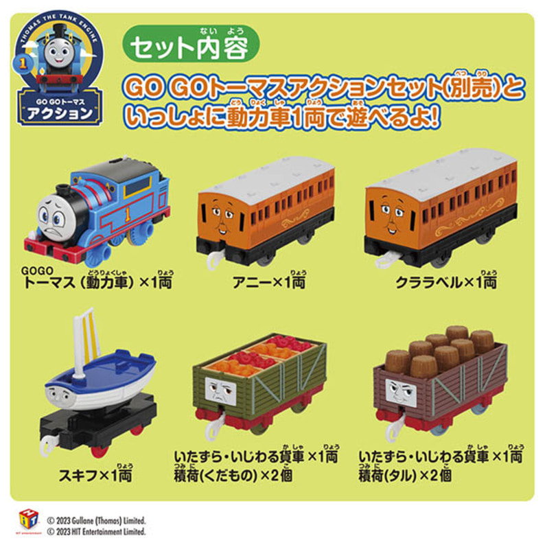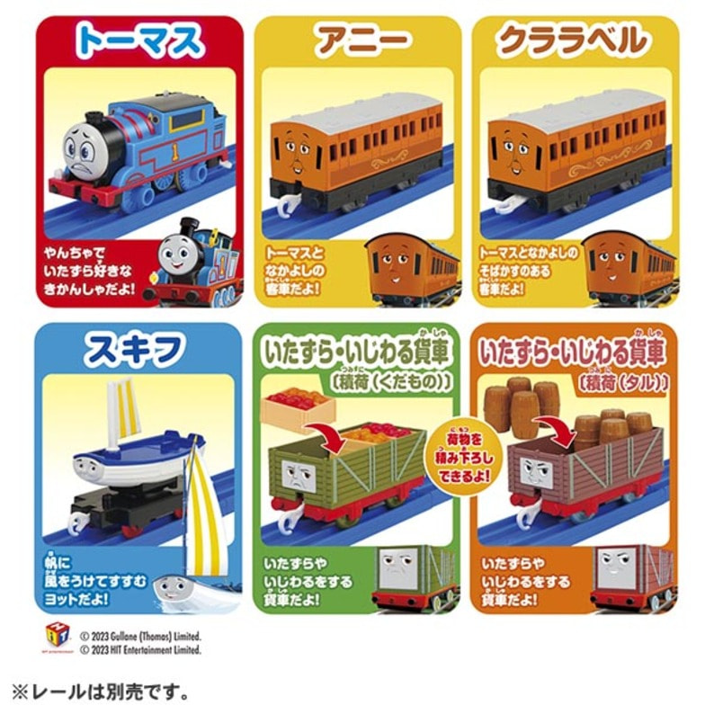 きかんしゃトーマスの新シリーズから、トーマスとなかまたちの車両セットが登場です。 なかまたちをいっぱいつなげて走らせよう! ■トーマス(動力車):やんちゃでいたずら好きなきかんしゃだよ! ■アニー&クララベル:トーマスとなかよしの客車だよ! ■いたずら・いじわる貨車:いたずらやいじわるをする貨車だよ! ■スキフ:帆に風をうけてすすむヨットだよ! ・動力車のトーマスに連結し、プラレールのレールを走行して遊べます。 ・GOGOトーマスアクションセット(別売)といっしょに動力車1両で遊べます。 (※連結した状態では、「滝にダイブ!アドベンチャーピーク」、「ぐるっと宙返り!わくわくプレイランド」は走行できません。) ・レール、車止め、電池は別売です。 ●パッケージサイズ:W290×H230×D55mm ●電池:単3形アルカリ乾電池×1(別売) ●対象年齢:3歳以上~ 【商品内容】 GOGOトーマス(動力車)(1)、アニー(1)、クララベル(1)、いたずら・いじわる貨車(1)、いたずら・いじわる貨車(1)、スキフ(1)、積荷(くだもの)(1)、積み荷(タル)(2)、部品注文書(1) ©TOMY ©2023 Gullane (Thomas) Limited. ©2023 HIT Entertainment Limited.