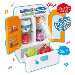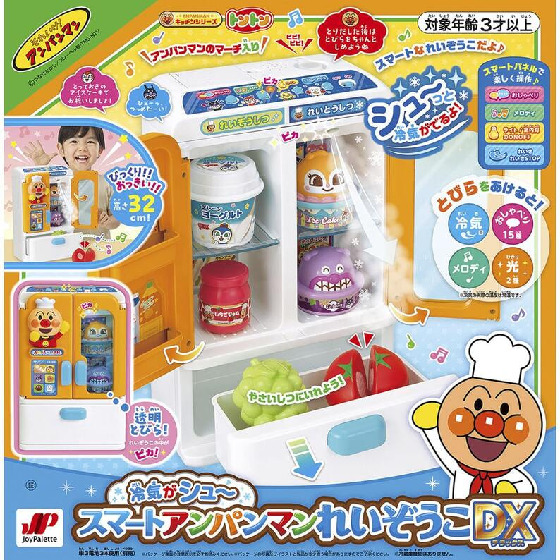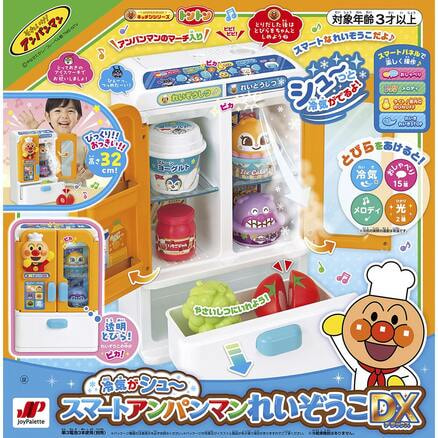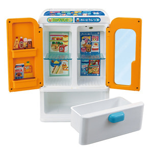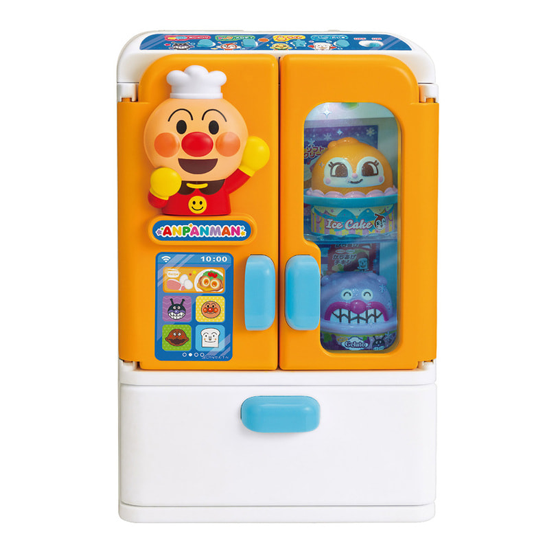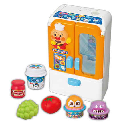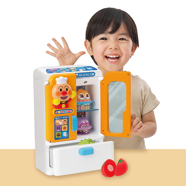 シューっと冷気がでるアンパンマンのれいぞうこ! 食材をれいぞうこに入れ、補給口から水を入れて電源オン! とびらを開けると、アンパンマンのおしゃべりが流れ冷気がシューッと吹き出します。(※冷気の実際の温度は常温です。) 同時に「アンパンマンのマーチ」のメロディが流れます。 本体上部にあるスマートパネルには、おしゃべりボタン、メロディボタン、ライトボタン、れいきボタンの4つのボタンがあり、スマートパネルでも操作ができちゃいます! スマートパネルのおしゃべりボタンを押すと、「れいぞうこの中には何があるかな~?」などアンパンマン、ばいきんまん、ドキンちゃんの楽しいおしゃべりが流れます。 メロディボタンを押すと「アンパンマンのマーチ」が流れ、音楽に合わせてパネルのLEDがピカピカ光ります。 れいきボタンを押すと、水蒸気を止めたり出したり操作ができます。(水蒸気は20秒のおやすみごとに5秒間吹き出します。) 食材は、パカっとわれるトマトトントンをはじめ、ばいきんまんアイス、ドキンちゃんアイスケーキ、いちごジャム、マスカット、ヨーグルトの6個入っています。 高さ32cmの大きなアンパンマンのれいぞうこでおままごと遊びを楽しもう♪ 【セット内容】 本体、ひきだし、棚板2枚、マスカット、トマトトントン、ドキンちゃんアイスケーキ、ケーキスタンド、ばいきんまんアイス、ヨーグルト、いちごジャム、スポイト ●商品サイズ:約幅200mm×高さ321mm×奥行き136mm ●パッケージサイズ:約幅330mm×高さ335mm×奥行き147mm ●パッケージ重量:2000g ●パッケージ形状:サック箱 ●電池情報:単3電池×3本使用(別売り) ●対象年齢:3才~ ●中国製 (C)やなせたかし/フレーベル館・TMS・NTV