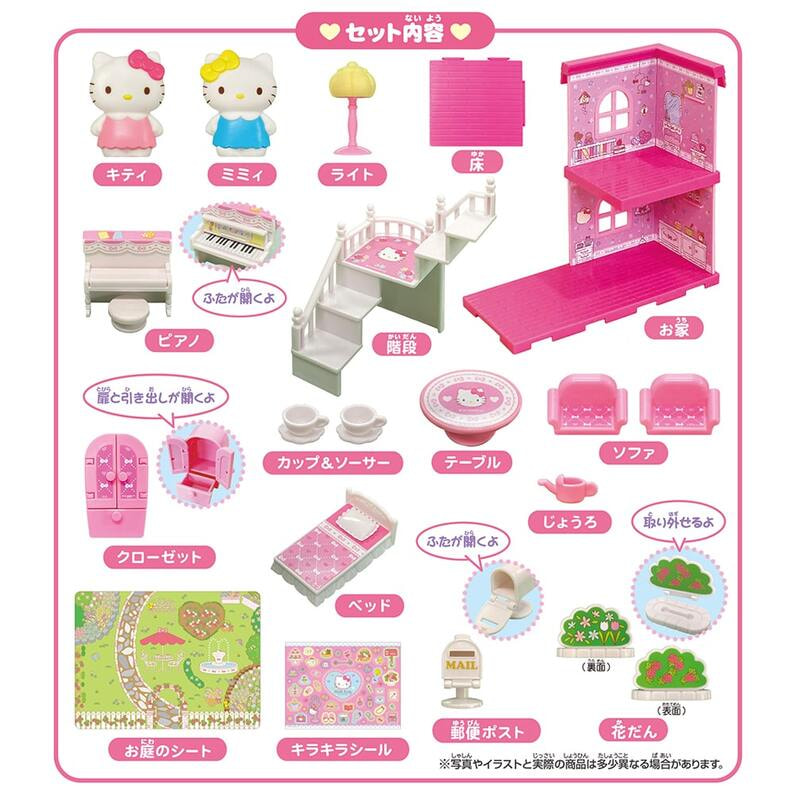 キティとミミィのお人形、かわいい階段や家具、お庭がセットになった2階建てのおうちです。 床のパネルの組み方によってレイアウトを変えられます。 付属のステッカーでおうちをかわいくデコレーションできます。 ●パッケージサイズ:約H245×W320×D110(mm) ●対象年齢:3歳~ (C)2023 SANRIO CO., LTD. TOKYO, JAPAN(L)