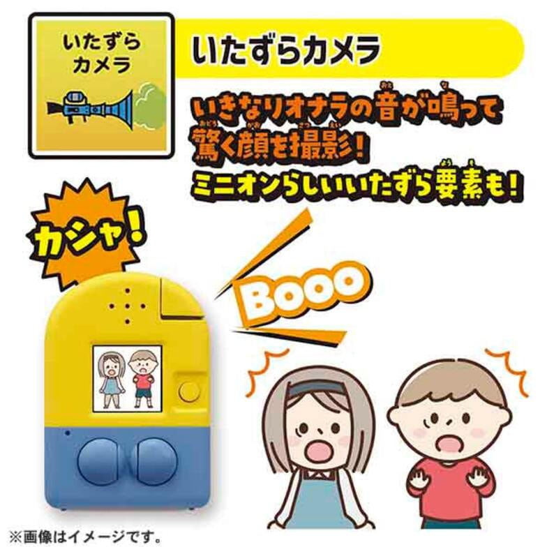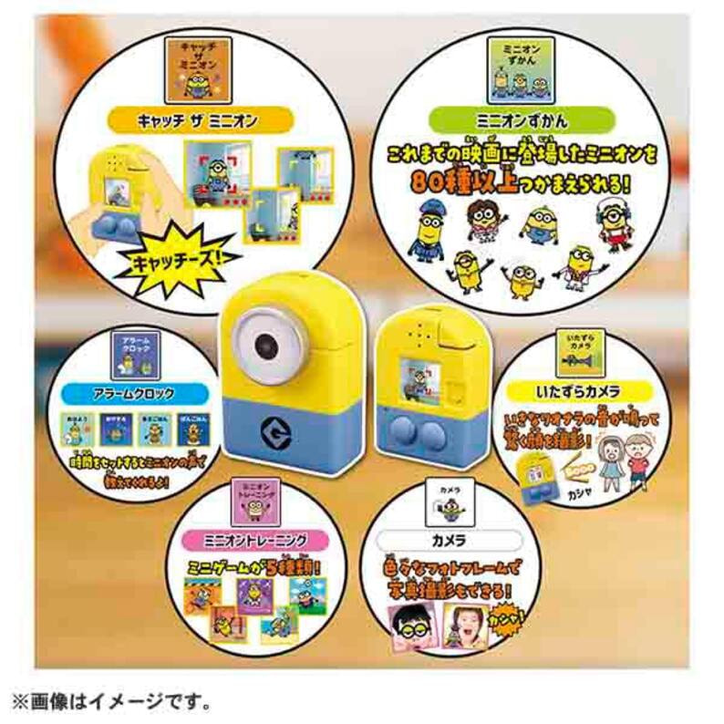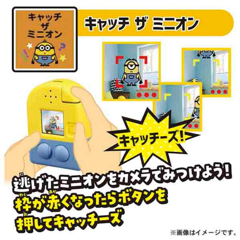 カメラでミニオンを見つけてキャッチーズ! ミニオン史上初のカメラ機能付き液晶トイが登場! カメラを使ってミニオンをつかまえよう! 本体を動かしながらミニオンを追いかけて、シャッターチャンス! つかまえたミニオンはミニオンずかんに登録可能! カメラモードでは写真を撮ったり、ミニオンのフォトフレームで撮影することもできちゃう! ミニオンの声やオナラの音を突然鳴らして、みんなのびっくりした顔を撮影できるいたずらカメラモードもあるよ! ミニオンと一緒に遊べる5種類のミニゲームも!本体を振ったりボタンを連打して遊んじゃおう! アラームクロック機能ではタイマーをセットするとミニオンの声で時間を教えてくれるよ! 色々なモードで遊んじゃおう! ●パッケージサイズ:約幅120mm×高さ150mm×奥行き70mm ●パッケージ形状:箱 ●電池情報:単4形アルカリ乾電池×3本(別売り) ●対象年齢:4歳以上 ●中国製 Minions Franchise(C)Universal City Studios LLC. All Rights Reserved.
