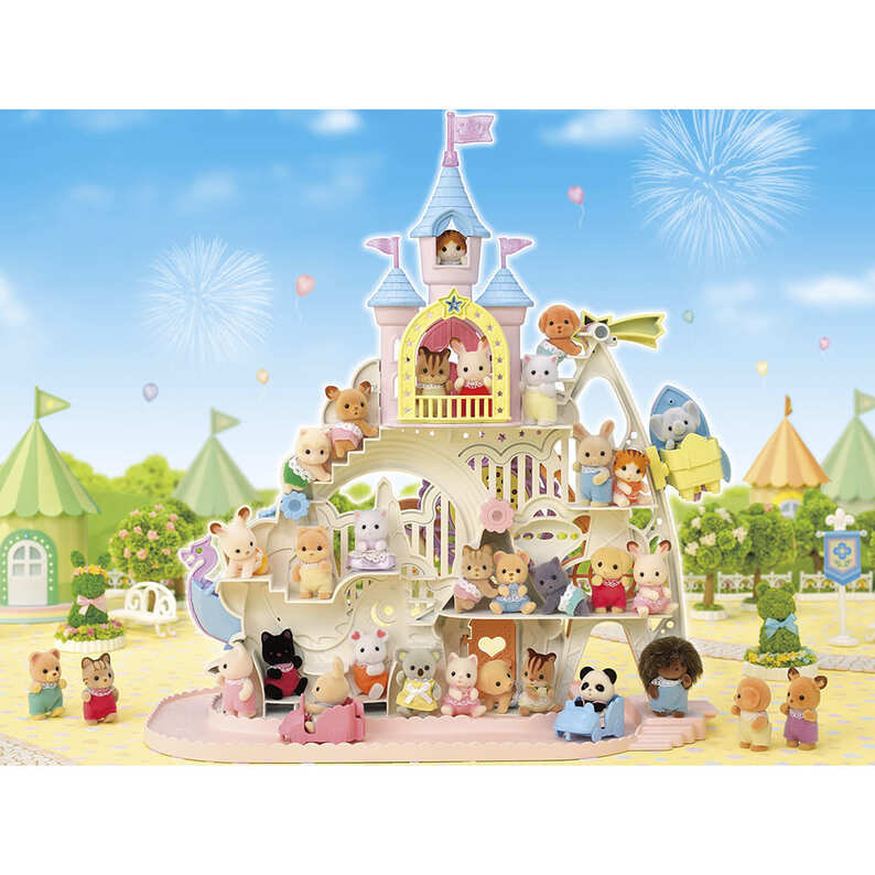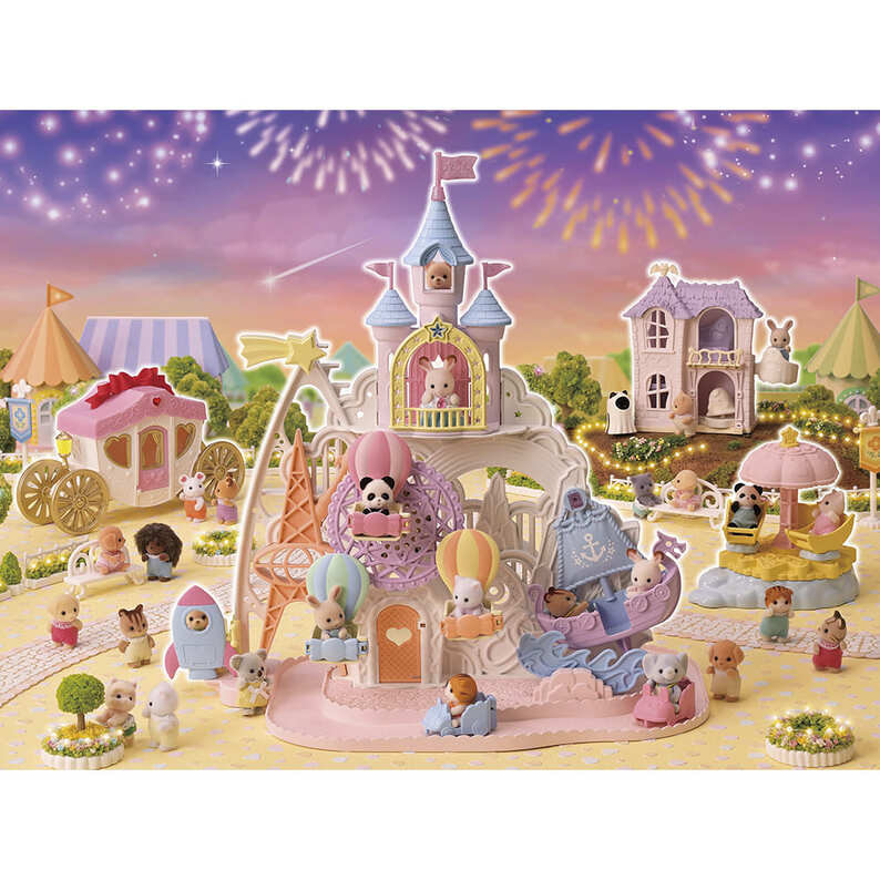 すてきなお城と乗り物がいっぱいのゆうえんち。 観覧車やバイキングなど、乗り物に赤ちゃん人形をたくさん乗せて遊べます。 可愛い赤ちゃん人形がついているので、この商品だけでもすぐに遊べます。 観覧車には、赤ちゃん人形を3にん乗せられ、くるくる回して遊べます。 バイキングには赤ちゃん人形をふたり乗せられ、船を揺らして遊べます。 ロケットには赤ちゃんをひとり乗せられ、上下して遊べます。 お城のテラスからは、ゆうえんちが見下ろせます。ゆうえんちの裏側にはテーブルと椅子があり、おしゃべりも楽しめます。 おかしの家のドアを開けると、ゴーカート乗り場があります。 ゆうえんちの裏側は赤ちゃん人形を並べられるディスプレイボード。 約30にんの赤ちゃん人形を可愛く並べる事が出来ます。 【セット内容】 本体、ベース、お城、旗(大)、旗(小)×2、ゴンドラ(ピンク)、(ブルー)、(イエロー)、バイキング、波、ロケット、ゴーカート(ウサギ)、ゴーカート(パンダ)、流れ星、パンダの赤ちゃん(おすわり)、みるくウサギの赤ちゃん(おすわり)、ペルシャネコの赤ちゃん(おすわり)、森のおはなし ●商品サイズ:W375×H404×D230(mm) ●パッケージサイズ:W380×H350×D180(mm) ●パッケージ重量:1428g ●対象年齢:3歳以上 ●中国製 ※画像はイメージです。実際の商品とは多少異なる場合がございますので、予めご了承下さい。 ※本商品のセット内容以外は付属しません。 (C)EPOCH