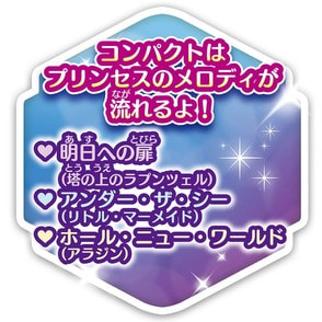 アリエル・ラプンツェル・ジャスミンが描かれた可愛いゆびわとゆびわをしまうコンパクトのセットです。 コンパクトはボタンを押すと音が流れます! メロディスイッチでは、プリンセス3人の物語で出てくるメロディが流れるよ! (①ホール・ニューワールド/アラジン、②アンダー・ザ・シー/リトル・マーメイド、③自由への扉/塔の上のラプンツェル) 効果音スイッチからは4種類の魔法の音が流れます! ●セット内容:コンパクト×1個、ゆびわ×5個 ●パッケージサイズ:幅180×高さ250×奥行き70(mm) ●電池情報:単4×2本使用(別売り) ●対象年齢:3歳以上 ●中国製 © Disney