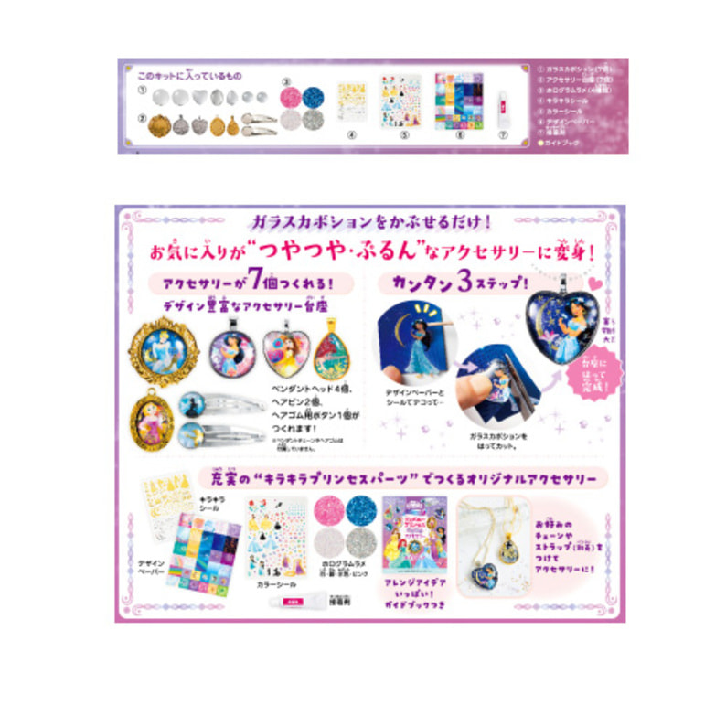 好きな絵にカボションガラスをかぶせるだけ! レジン風の”つやつや・ぷるん“なオリジナルアクセサリーが作れる人気シリーズ! ホログラムラメやキラキラシールを使ってディズニープリンセスのキラキラアクセサリーが作れます♪ 【セット内容】 ・ガラスカボション(7個) ・アクセサリー台座(7個) ・ホログラムラメ(4種類) ・キラキラシール ・カラーシール ・デザインペーパー ・接着剤 ・ガイドブック ●パッケージサイズ:幅250×高さ210×奥行き30(mm) ●中国製 © Disney www.disney.com