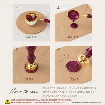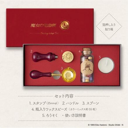 『魔女の宅急便』のシーリングワックスセットが登場! スタンプ面は、作中に登場する【キキの看板】がモチーフです。 スタンプだけでなく、必要な道具がセットになっているので、すぐに始められます。 ワックスで手紙を留めるのはもちろん、プレゼントのワンポイントに付けたり、加工してキーホルダーなどにもでき、楽しみ方がたくさん! 初心者の方でも楽しめるよう、丁寧な使い方説明書付き。 QRコードから詳しい解説やコツ、ワックスの楽しみ方もご覧いただけます! ※こちらはお子さま向けの商品ではありません。お子さまの使用は危険ですのでおやめください。 ※こちらの商品は火を使用します。火の取り扱いには十分ご注意ください。 【セット内容】 スタンプ&ハンドル スプーン 瓶入りワックスビーズ(カラーミックス約55粒) ろうそく 使い方説明書 【サイズ(約)】 商品パッケージ:W220×H32×D97mm スタンプ(柄装着時):直径25×H65mm スプーン:W35×H100×D20mm コルク瓶:直径3×H75mm 【材質】 鉄、銅、天然木、コルク、ガラス、蝋(パラフィン・樹脂)アルミ、紙、PU、OP (C)1989 Eiko Kadono-Studio Ghibli-N