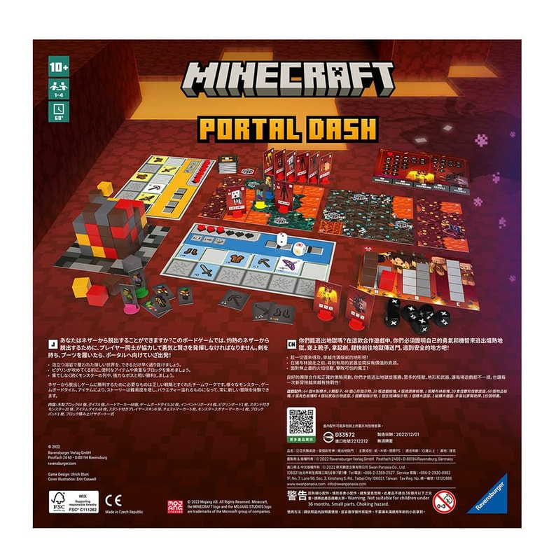 木製ブロック×64、ダイス×8、ハートマーカー×48、ゲームボードタイル×10、インベントリボード×4、ピグリンボード×1、スタンド付きモンスター×20、アイテムタイル×68、スタンド付きプレイヤースキン×8、チェストマーカー×5、モンスタースポナーマーカー×1、ブロックパッド×1、ブロック積み上げサポート一式、日本語説明書