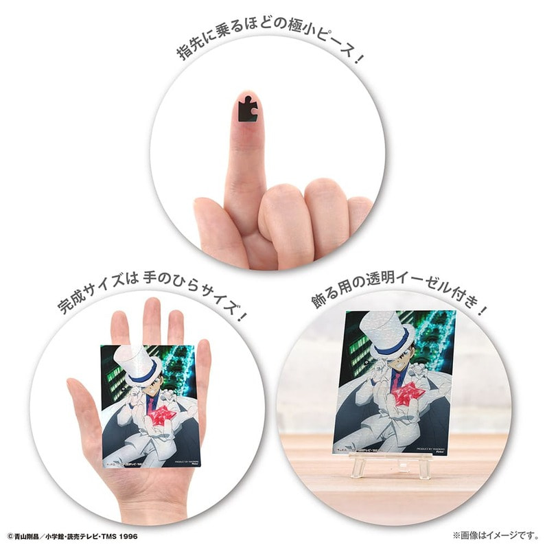『名探偵コナン』のキャラクターたちと星のモチーフがロマンティックな印象を与えるシリーズ。 星形の宝石を盗み出した怪盗キッド。 夜空の星のようなお宝は誰かへのプレゼントなのかもしれません。 プチパリエシリーズはピース1つの大きさは1cm以下のスモールサイズ。 手のひらに乗るくらいの小さなイーゼルに可愛らしく飾ることが出来るミニチュアサイズのジグソーパズルです。 プラスチック製なのでノリ不要、飾る為のイーゼル付属です。 ●ピース数:150ピース ●完成サイズ:7.6×10.2cm ●付属品:ミニイーゼル
