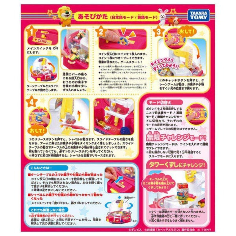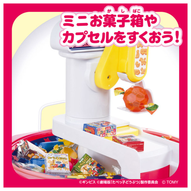 たべっ子どうぶつ THE MOVIE のクレーンゲーム! おうちでクレーンゲーム遊び放題! カプセルやミニお菓子箱をクレーンですくったら、動くスライドテーブルの上にうまく落とそう! 2つのボタンでクレーンを操作可能で、コインを入れるとメロディが流れます。 日本語と英語の音声切り替えが可能です。 「無限チャレンジモード」にすると、コインを入れなくても遊べる! 【商品内容】 ・本体×1個 ・コイン×10枚 ・ボーナスカプセル(赤色×1個、青色×1個) ・ラベル×1枚 ・ミニお菓子箱シート×1枚 ※お菓子は入っていません。 ●パッケージサイズ:W350×H350×D300mm ●電池情報:単2形アルカリ乾電池×3個使用(別売り) ●対象年齢:4歳以上 ●原産国:ベトナム ©ギンビス ©劇場版「たべっ子どうぶつ」製作委員会 ©TOMY