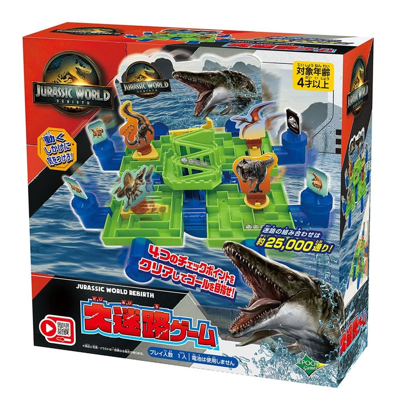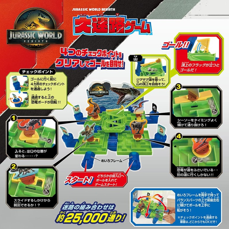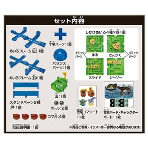 めいろフレーム(左)×1、めいろフレーム(右)×1、しかけめいろ(4種×各1)×4、スタンドパーツ(2種×各1)×2、山×1、ボール×2、十字パーツ×1、バランスパーツ×1、コマ台××4、恐竜コマシート×1、背景ボード・キャラクターボード×1、取扱説明書×1