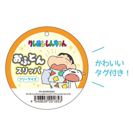 しんちゃんとシロがおふとんに潜り込んだデザインがとってもかわいい♪ ふっくらとした履き心地のスリッパです! ●サイズ:W110×H180×D270mm ●素 材:ポリエステル・ソフトボア ●生産国:中国