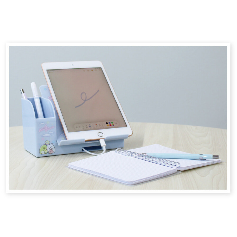 付箋を貼ってメモスタンドや、本やスマホ、タブレット置きなどマルチに使える! スタンドを開くと小物も収納できます♪ 充電しながら使えるコード穴付き! ●サイズ:約W175×H120×D120mm ●素 材:ABS ●中国製