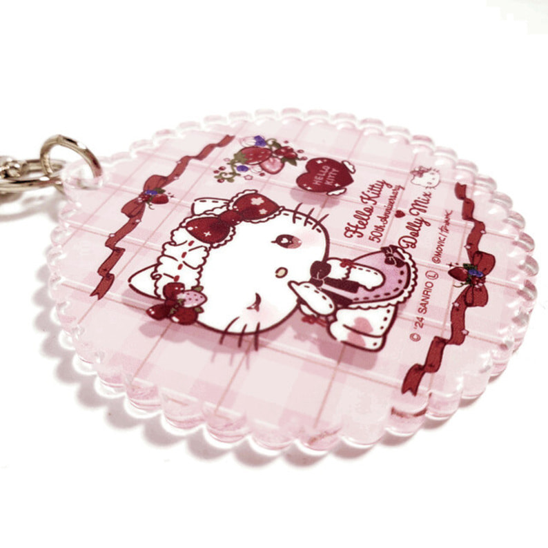 【HELLOKITTY×DOLLYMIX】のトレーディングアクキーが発売!! ハローキティ50周年記念♡ イラストレーターのなつめみくさんが手掛けるイラストブランド「DOLLY MIX(どーりーみっくす)」とのコラボアイテムが登場! いちご型のナスカンが特徴的なアクリルキーホルダーです。 トレーディングなので何が出るかはお楽しみ♪ ●サイズ:約W5.5×H5.8×D0.5cm(金具含まず) ●素 材:本体/アクリル ナスカン/鉄 ●生産国:日本 ※全5種のうちどれか1つがランダムに入っています。複数お買い求め頂いても同じ絵柄が続けて出たり、ご希望の絵柄が出ない場合もございます。また、絵柄が重複しましても交換依頼はお受け致しかねます。 © 2024 SANRIO CO. LTD. ©MOVIC/なつめみく