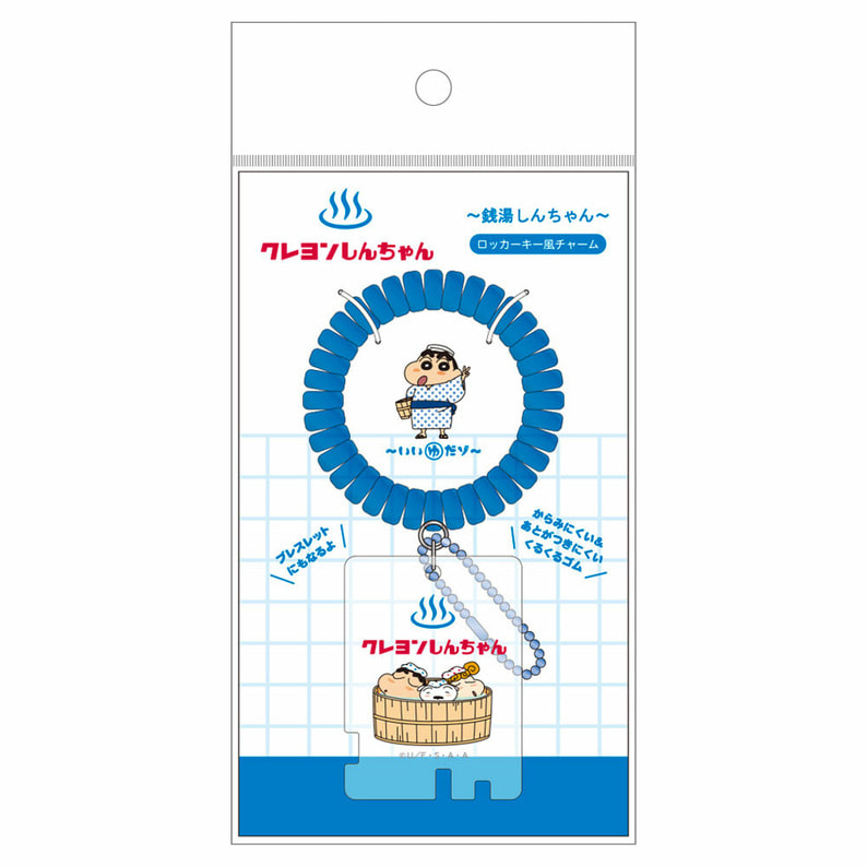 クレヨンしんちゃんから銭湯しんちゃんシリーズが新登場! 銭湯のロッカーキーのようなデザインが可愛い、ロッカーキー風チャームです。 髪にからみにくい&あとがつきにくいくるくるゴム仕様! ブレスレットにもでき、銭湯やサウナのお供にも♪ ボールチェーン付きだからカバンや好きなところに付けられます! ●商品サイズ:W60×H110×D10mm(ゴム:約Φ60×D10mm) ●パッケージサイズ:W91×H185×D12mm ●素材:ポリウレタン・アクリル樹脂 ●原産国:中国