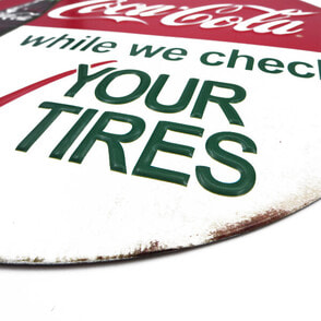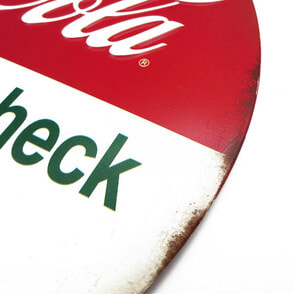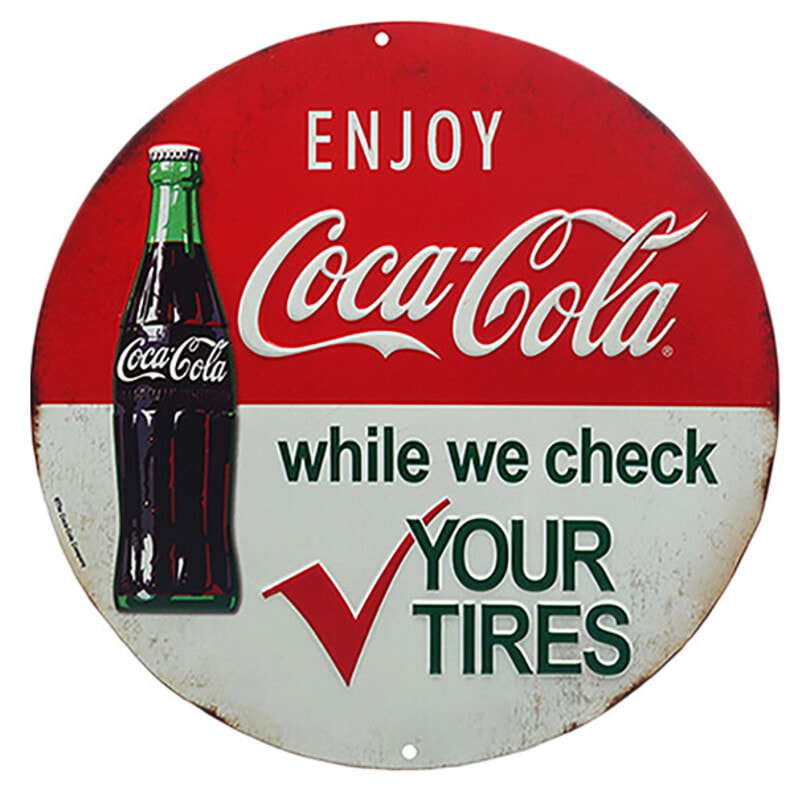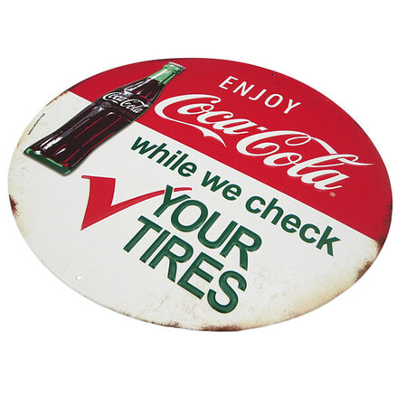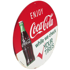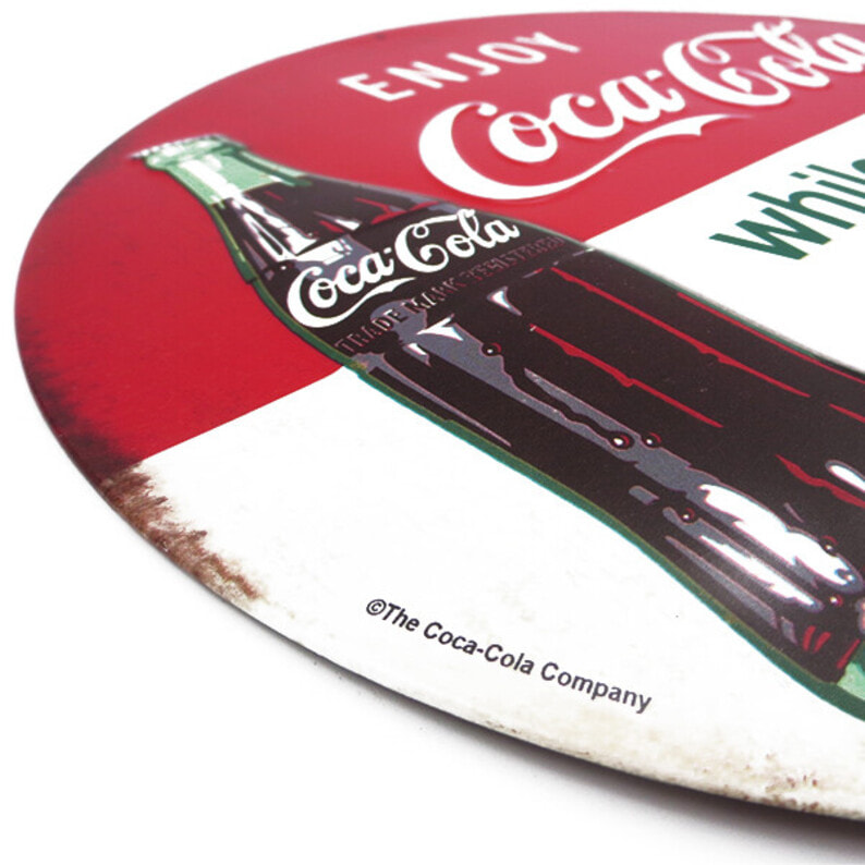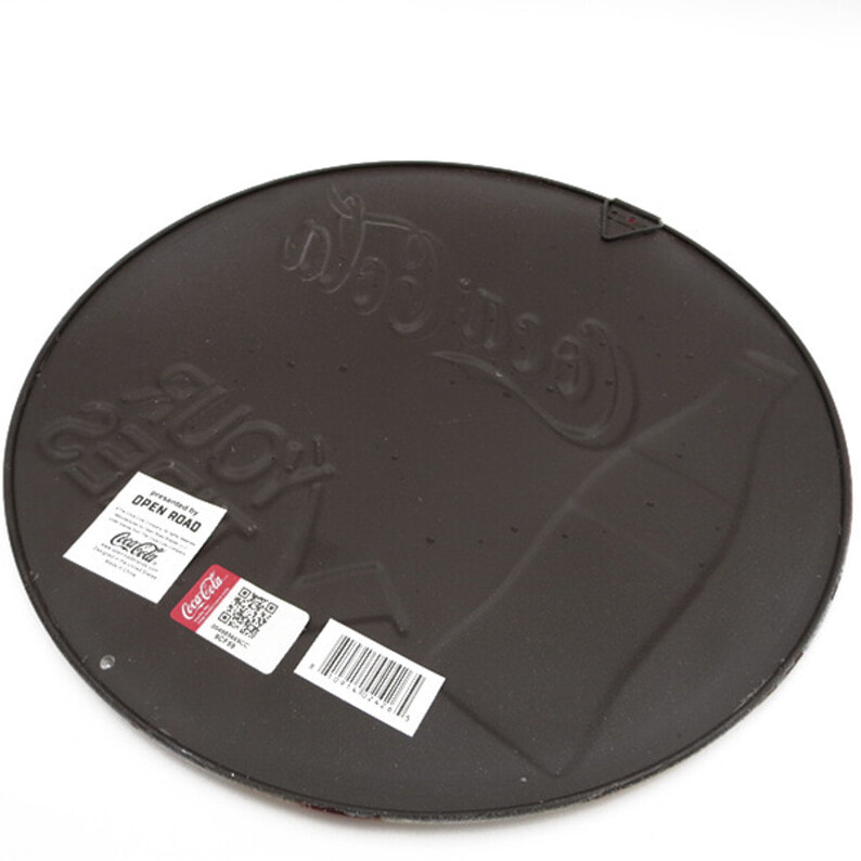 エンボス加工のアメリカンダイナーデザインのコカコーラメタルサイン♪ ダメージプリントがされており、新品なのにアンティーク感がバッチリ出てます。 コカ・コーラのプレートが飾られているだけで、アメリカンな雰囲気になるのが不思議ですよね。 アメリカンテイストが詰まった看板です! 看板の上と下部分に穴が開いていて、金具も付いていますので、ガレージやキッチンの壁にも簡単にディスプレイできます。 ●商品サイズ:約Φ305mm ●素材:ブリキ ●原産国:中国