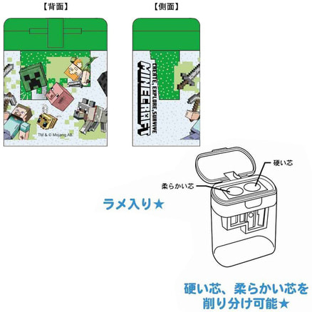 Minecraft(マインクラフト)から鉛筆削りが登場! 硬い芯、柔らかい芯を削り分け可能です。 ラメ入り仕様なのでキラキラでかわいい♪ ●商品サイズ:W41×H51×D29mm ●素材:PP、AS樹脂、スチール、スチロール樹脂 ●原産国:日本